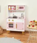Gran Cocina Candy Chic totalmente en madera con un colgador para colgar la cuchara de metal, 1 cacerola con su tapa metálica y 3 cajas de alimentos de cartón (zumo de naranja, cacao, azúcar).